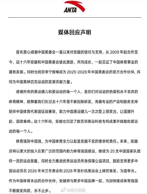 安踏曾于2009至2024年成为中国奥委会官方合作伙伴及2022年北京冬奥会和冬残奥会官方合作伙伴。在一份公告中,安踏表示:“由衷感谢中国奥委会一直以来对安踏的信任与支持,从2009年起合作至今,这十六年安踏和中国奥委会彼此激励,共同成长,一起见证了中国体育事业的蓬勃发展。同时也祝贺李宁接棒成为2025至2028年中国奥委会的官方合作伙伴,共同为中国奥林匹克运动的发展贡献力量。