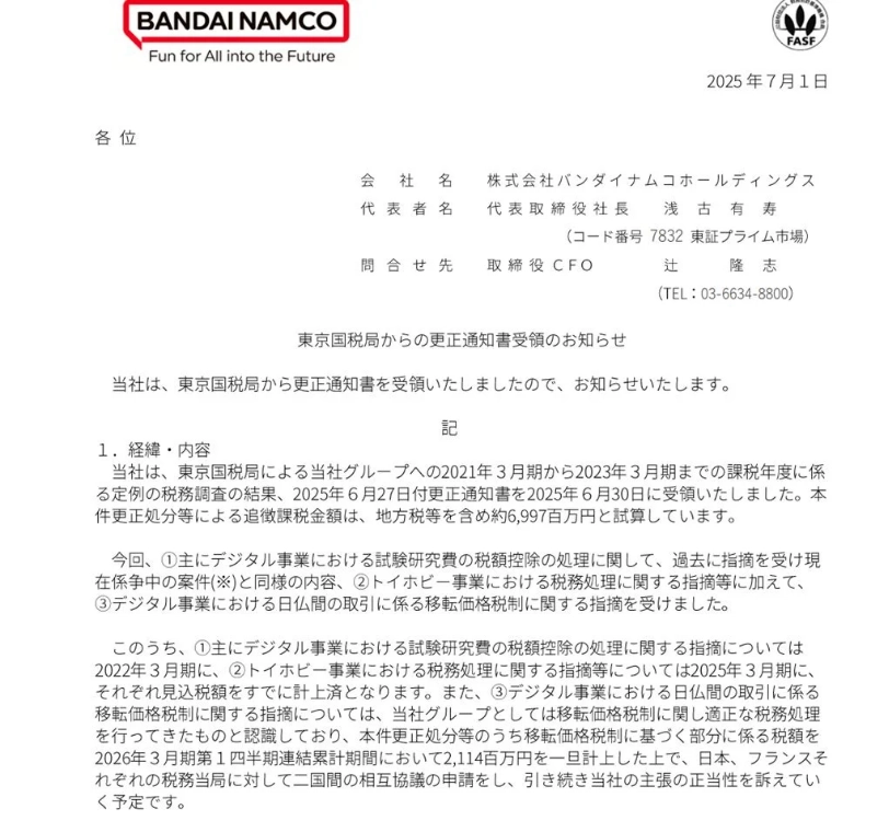 IT之家 7 月 1 日消息,万代南梦宫于 7 月 1 日宣布,已收到东京国税局发出的更正通知书。